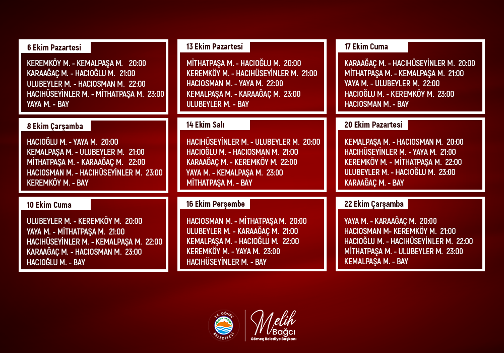 Maçlar 6-8-10-13-14-16-17-20 ve 22 Ekim tarihlerinde saat 20.00, 21.00, 22.00 ve 23.00’te Gömeç Sahası’nda oynanacak.